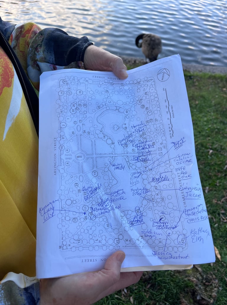 The project has its origins in an assignment for her Environmental Ethics students at Emerson College where the Public Garden was transformed into a field research site. Each student chose a tree to research on three registers: objectively, artistically, and ethically. The students then shared their reflections on a “Woods Walk.” Future Monument to the Trees of the Public Garden extends the spirit of that original assignment to create a shared event for the public to experience together (including the trees!), thereby enacting shared authorship of the city of Boston.